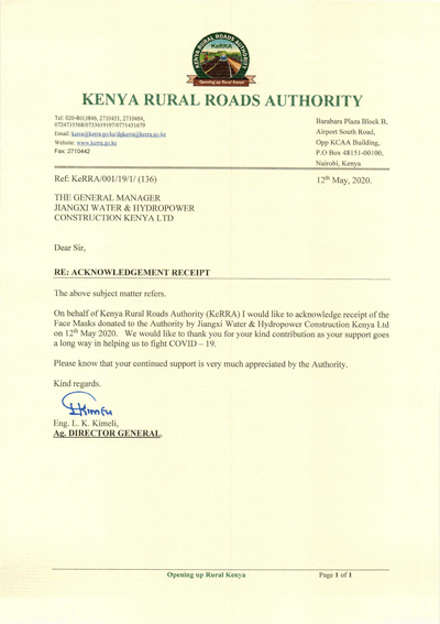 收到來自江西水建捐贈(zèng)的防疫物資后,肯尼亞鄉(xiāng)村公路局局長(zhǎng)由衷地表示感激,并向肯尼亞分公司寫了一封感謝信,他在信中表示:“江西水建友好慷慨的捐贈(zèng),將為我們對(duì)抗新冠肺炎疫情提供長(zhǎng)遠(yuǎn)的支持,肯尼亞鄉(xiāng)村公路局對(duì)此深表感激?!?