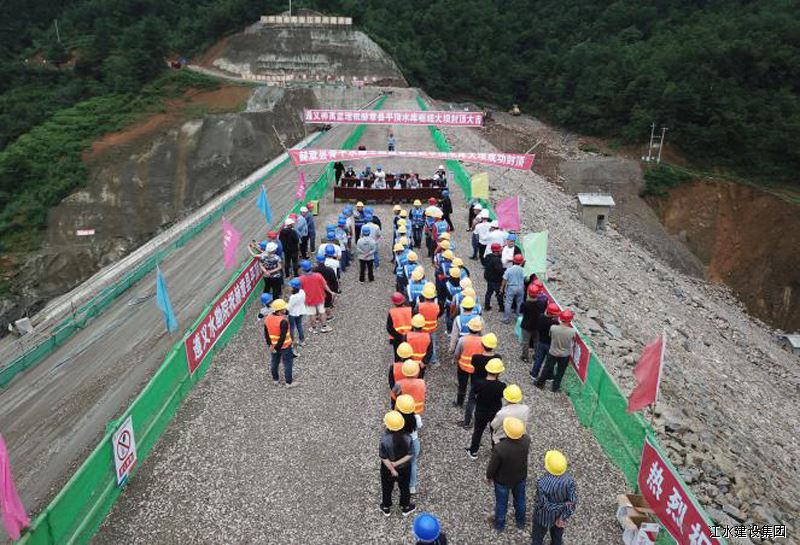 該工程是一座混凝土面板堆石壩,壩高47m,大壩填筑工程量42m3,大壩于2021年3月5日開始填筑,2021年6月30日填筑完成。大壩填筑完成后,得到了建設(shè)單位、監(jiān)理單位及總包單位的祝賀與肯定。該工程屬貴州省“鄉(xiāng)鄉(xiāng)有穩(wěn)定水源”項(xiàng)目,年供水量250.8萬m3,建成后可為安樂溪鄉(xiāng)集鎮(zhèn)及農(nóng)村20000余人提供安全穩(wěn)定供水和21670畝農(nóng)田灌溉用水以及將極大緩解當(dāng)?shù)厝彼桶踩嬎畣栴},意義重大。施工項(xiàng)目部將繼續(xù)堅(jiān)持“科學(xué)管理、精心組織”理念,嚴(yán)格按設(shè)計(jì)和規(guī)范要求,在確保安全和質(zhì)量的前提下加快施工進(jìn)度,為安樂溪人民盡早提供安全水、干凈水及改善供水目標(biāo),確保在合同工期以內(nèi)按時(shí)、按質(zhì)、按量盡早建成交付建設(shè)單位投入使用。集團(tuán)副總裁胡鴻煌參加大壩封頂儀式。