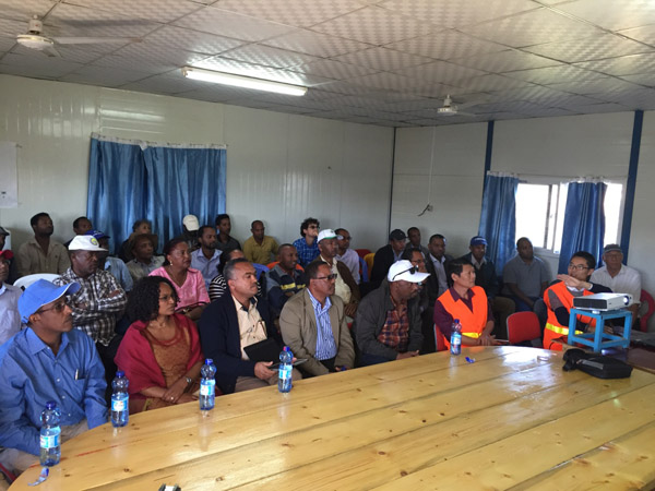 部長一行于上午10時(shí)許抵達(dá)后,在我項(xiàng)目部主營地召開了現(xiàn)場會(huì)議,埃塞公司副總經(jīng)理兼項(xiàng)目經(jīng)理黃生寶詳細(xì)的介紹了項(xiàng)目的進(jìn)展情況及六大施工管理區(qū)的實(shí)施情況。并表示,盡管面臨著工期縮短、征地困難等諸多阻礙,我司一定會(huì)團(tuán)結(jié)各方、迎難而上,完成施工任務(wù)為埃塞水利發(fā)展貢獻(xiàn)力量。