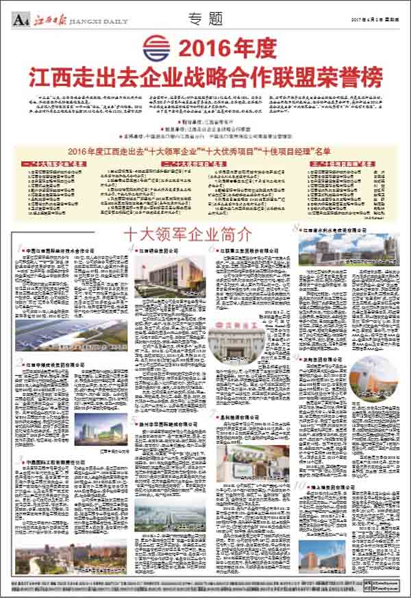6月3日,江西走出去企業(yè)戰(zhàn)略合作聯(lián)盟2017年大會在南昌召開。省委常委、常務副省長毛偉明出席大會并作重要講話,會上省委常委、常務副省長毛偉明、省政府秘書長王亞聯(lián)和省商務廳廳長王水平分別為2016年度全省走出去“十大領(lǐng)軍企業(yè)”、“十大優(yōu)秀項目”和“十佳項目經(jīng)理”授牌。江西走出去企業(yè)戰(zhàn)略合作聯(lián)盟輪值主席、中國江西國際經(jīng)濟技術(shù)合作公司總經(jīng)理徐國建報告了2016年工作,國家開發(fā)銀行江西分行、中國進出口銀行江西省分行和中國出口信用保險公司南昌營管部作為聯(lián)盟副主席單位發(fā)言。公司董事長王元旦作為十大優(yōu)秀項目的企業(yè)代表發(fā)言?!督魅請蟆贰ⅰ督餍l(wèi)視》相繼對大會進行了大幅報道。