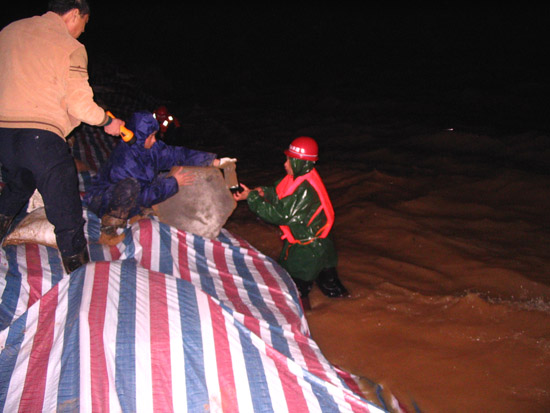根據(jù)以往的施工經(jīng)驗(yàn),我們很快啟動(dòng)了搶險(xiǎn)應(yīng)急預(yù)案。但由于環(huán)境惡劣,考驗(yàn)我們的時(shí)候到了,要發(fā)揚(yáng)我們江西水建人“特別能吃苦、特別能戰(zhàn)斗、特別能忍耐、特別能協(xié)作精神”的時(shí)候到了,我們與洪水搶時(shí)間、爭進(jìn)度,全體干群在漆黑的大堤上是一片穿梭奔跑的身影,大家齊心協(xié)力,手提肩扛,把一百多斤一塊的混凝土預(yù)制塊,一塊塊運(yùn)到堤腳,此時(shí)項(xiàng)目部總工曾俊平不顧江水的寒冷,帶領(lǐng)其它幾名員工,奮身躍入水中,在水下鋪設(shè)彩條布,而此時(shí)水下溫度只有10℃左右,渾濁江水一浪高過一浪拍打在他們的身上。大家顧不上寒冷,顧不上疲勞,顧不上饑餓,衣服濕了又干,干了又濕,分不清是哪次被汗水還是雨水弄濕的,在微弱的手電光照亮下鋪設(shè)了一條又一條彩布條,碼起了一道又一道沙包小堤。經(jīng)過大家的緊張奮戰(zhàn),終于幾處險(xiǎn)情得到了控制,等到我們?cè)诿β抵谢剡^神來時(shí),已經(jīng)是次日的凌晨三點(diǎn)多鐘,盡管大家拖著一副疲憊不堪的泥身子,但大家臉上裝滿了滿意和勝利的微笑,王總此時(shí)飽含真情地對(duì)大家說了一聲:“大家真的辛苦了,謝謝大家!”走在回家的路上,我正好與項(xiàng)目總工曾俊平走在一起,我看到他渾身濕漉漉的,我關(guān)心的問他在水中冷嗎?他笑笑說道:“這是關(guān)鍵時(shí)刻,再冷也要下”。他旁邊的同事告訴我,他是從下午三點(diǎn)鐘就一直在水里做事直到剛才,整整在水中浸泡了十二個(gè)小時(shí)。我們參加搶險(xiǎn)的同志被曾俊平這種不怕困難、不畏艱險(xiǎn)、不顧個(gè)人安危、敢于吃苦的精神深深感動(dòng)著,真是我們學(xué)習(xí)的好榜樣!