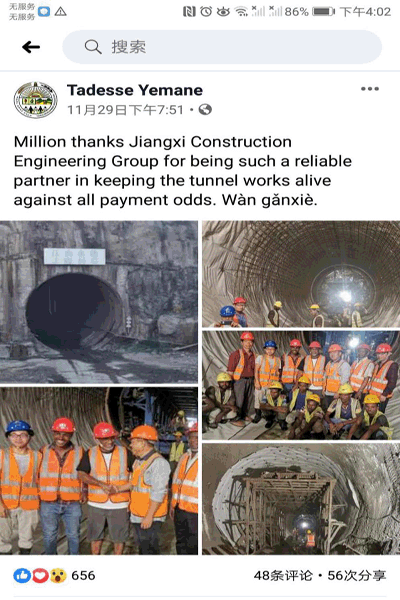 參觀結(jié)束時(shí),Tadesse先生由衷感謝大家的辛勤付出,對(duì)項(xiàng)目部順利完成隧洞首倉(cāng)襯砌砼表示高度贊許,并相信項(xiàng)目部一定能保質(zhì)保量完成隧洞二期襯砌施工。Tadesse先生還在Facebook(臉書)平臺(tái)分享了本次隧洞參觀的經(jīng)歷,并表達(dá)了對(duì)我公司作為戰(zhàn)略合作伙伴的充分信任。