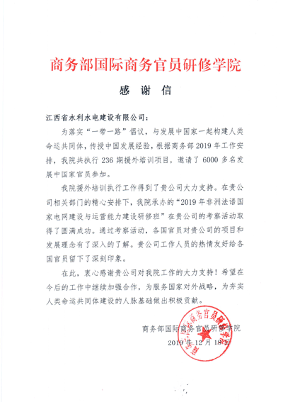2019年,公司圍繞國(guó)家和我省“走出去”戰(zhàn)略,積極配合商務(wù)部及省內(nèi)援外培訓(xùn)工作,得到各方認(rèn)可。近日,公司收到來(lái)自商務(wù)部國(guó)際商務(wù)官員研修學(xué)院的感謝信,信中提到,商務(wù)部研修學(xué)院援外培訓(xùn)工作得到我公司的大力支持,“2019年非洲法語(yǔ)國(guó)家電網(wǎng)建設(shè)與運(yùn)營(yíng)能力建設(shè)研修班”考察、交流活動(dòng)取得圓滿(mǎn)成功,對(duì)公司的積極配合表示衷心感謝。