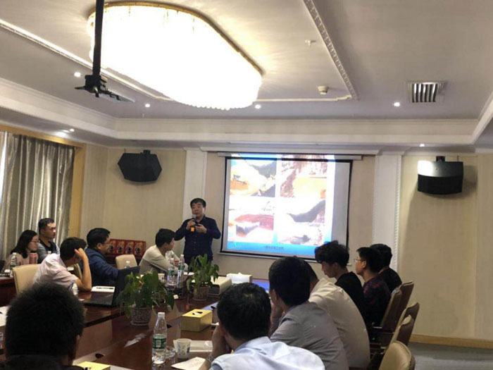 現(xiàn)場參觀結(jié)束后,學(xué)習(xí)團(tuán)參加了技術(shù)培訓(xùn)和經(jīng)驗(yàn)交流會(huì)。總經(jīng)理助理杜凌主持了開班儀式??偣こ處熀櫥?、項(xiàng)目副經(jīng)理李成,對(duì)洋前壩水庫的大壩總布置、大壩施工導(dǎo)流、大壩及供水管道施工技術(shù)細(xì)節(jié)等,通過文字、圖片、視頻等組成的PPT課件為學(xué)員授課,并就學(xué)員提出的問題逐一進(jìn)行了解答。