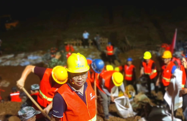 彭燦華是第一時間帶領(lǐng)抗洪搶險隊員趕赴現(xiàn)場與洪水戰(zhàn)斗的先遣軍。他連夜指導施工人員開展搶險工作,天黑路滑,他幾次摔倒在泥濘中,眼鏡上沾滿了泥點,渾身早已被泥水覆蓋,即便這樣,他還是一邊了解汛情水情,一邊指揮搶險,一邊將一線汛情匯報給公司,一邊頂著傾盆大雨加入到搶險的隊伍中,裝袋抬土,和搶險施的隊伍們奮戰(zhàn)在一起。